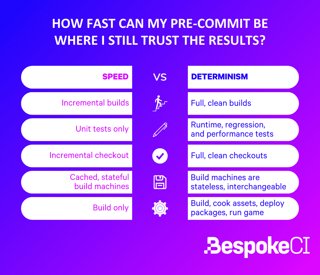 You might find yourself making trade-offs though, depending on what your goal is. Maybe you decide to run an incremental build on a pre-warmed build machine. That can give engineers a moderate level of confidence in their change, but the lack of determinism can quickly erode all trust. Did your pre-commit fail because your change is bad, or did the last person who ran pre-commit leave a landmine?
